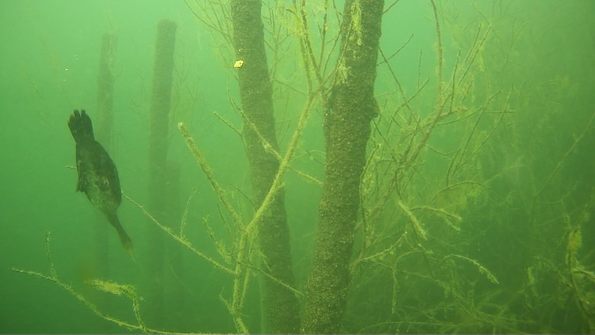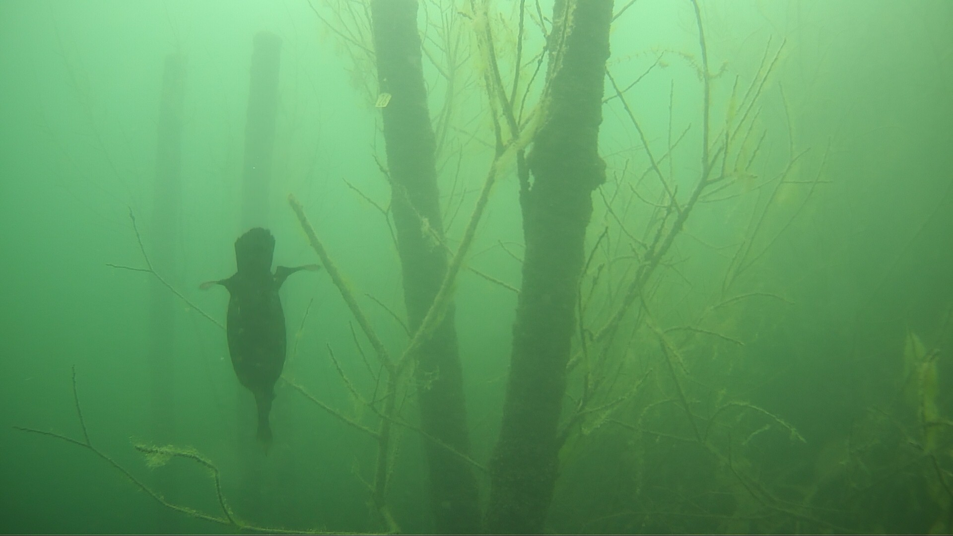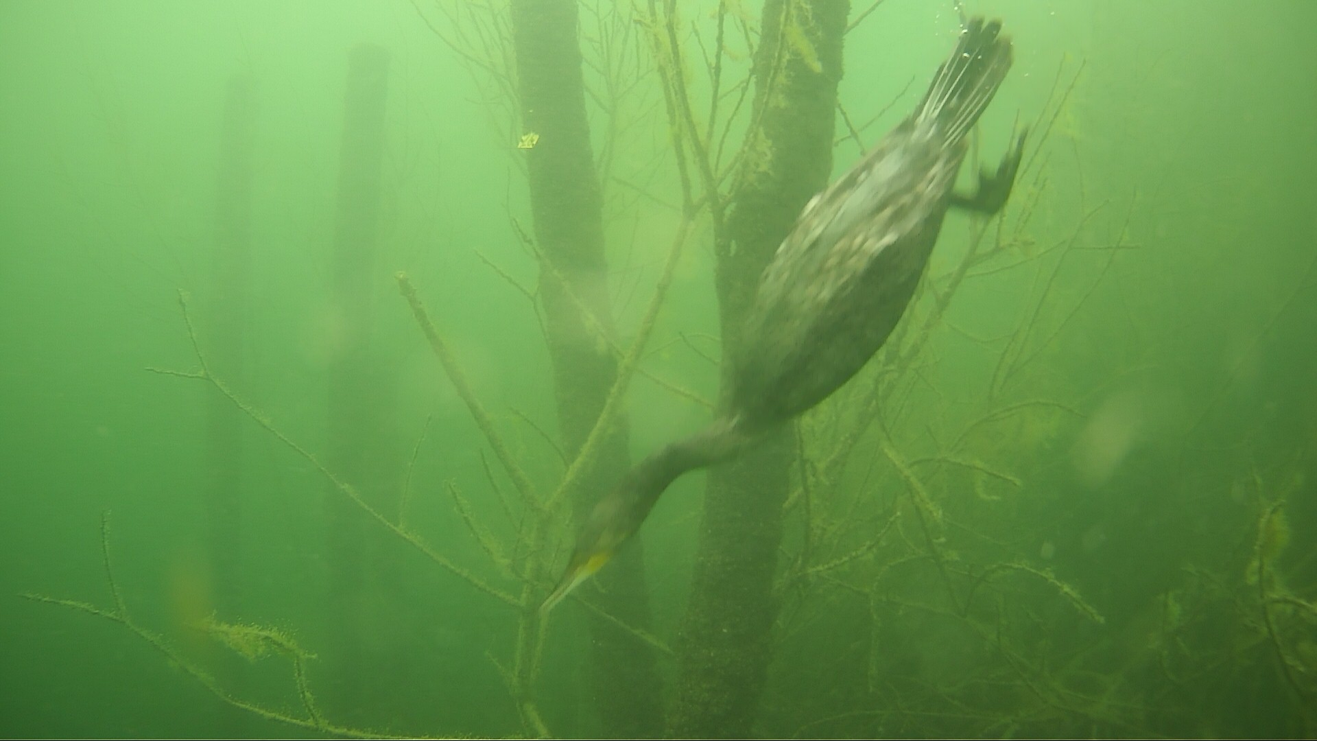 28.05.2020 – Die Sicht ist von Algen dominiert, den Kormoran erkennt man dennoch deutlich.