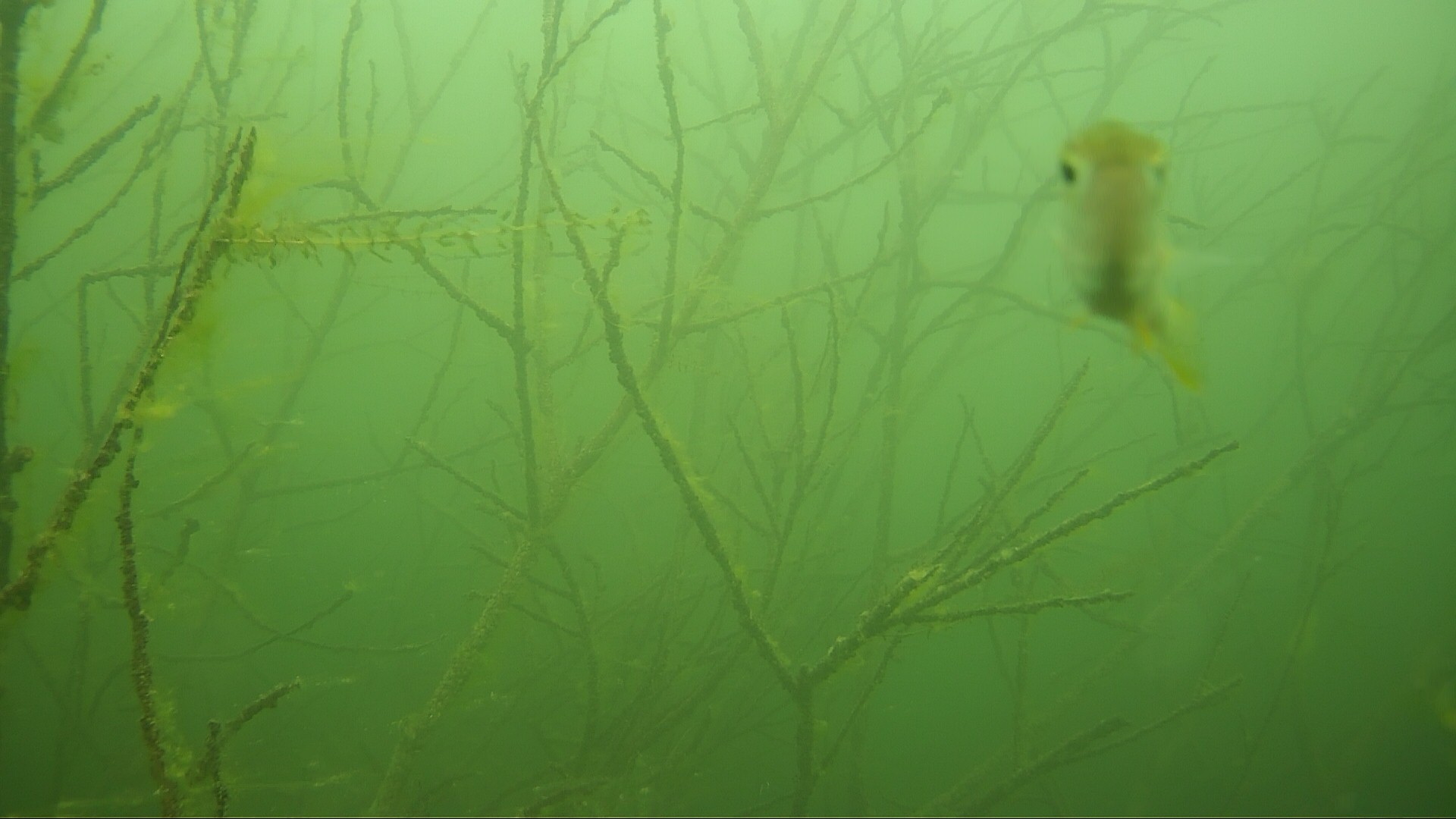 08.07.2020 – Der Barsch und die Wasserpest. Erinnert ihr euch: die war schon einmal im Bild gehangen. Da hat man sie aber nicht so gut gesehen.