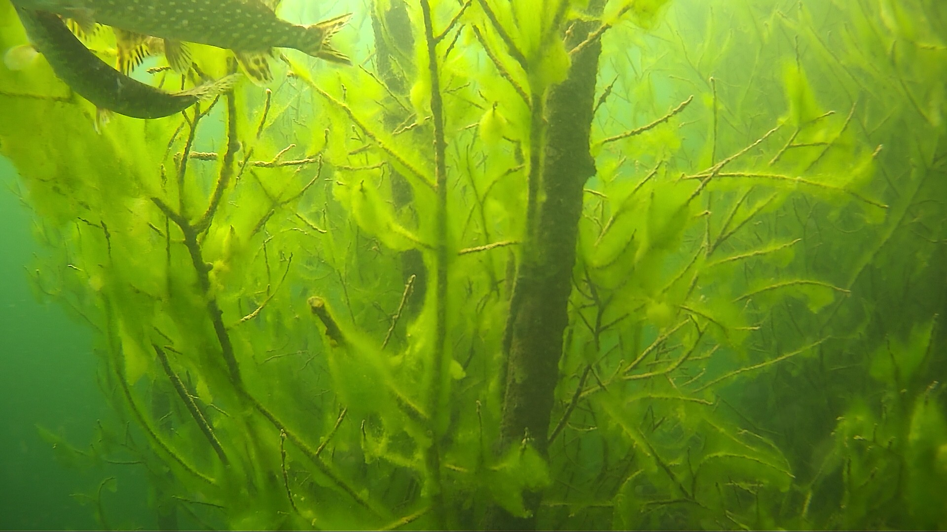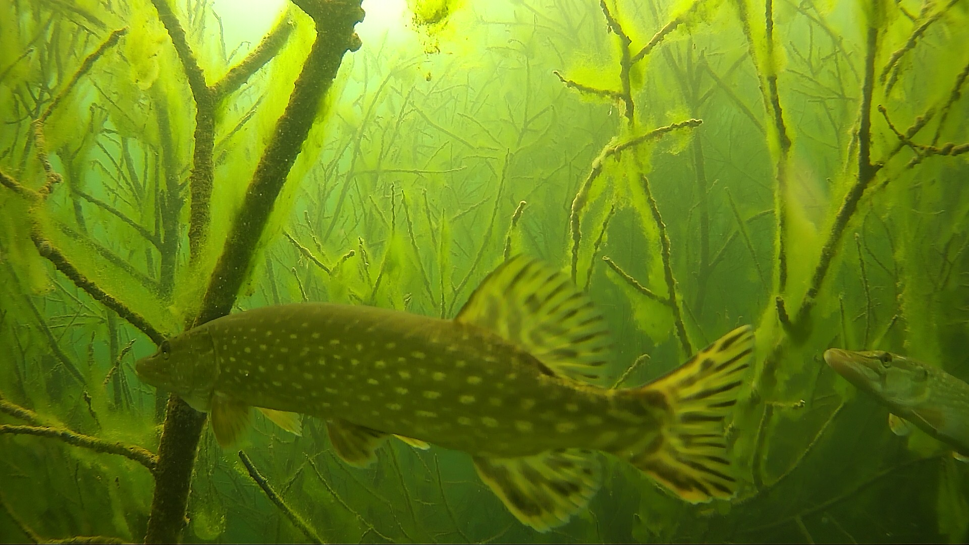 19.05.2020 – Der Hecht scheint nicht hungrig zu sein, zumindest empfinden die Barsche ihn bei diesem Schnappschuss nicht als gefährlich. Habt ihr ihn schon gefunden?