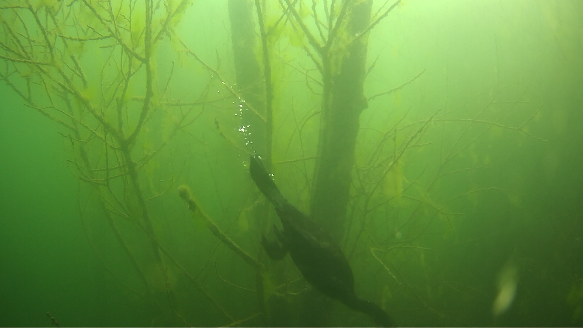27.05.2020 – Am Nachmittag scheint der Kormoran Erfolg gehabt zu haben. Ganz sicher gibt das Bild es aber nicht her, ob da wirklich ein Fisch im Maul steckt.