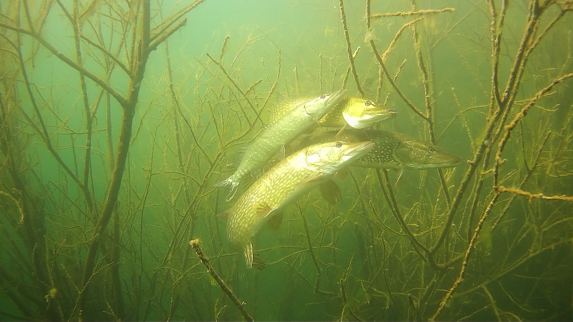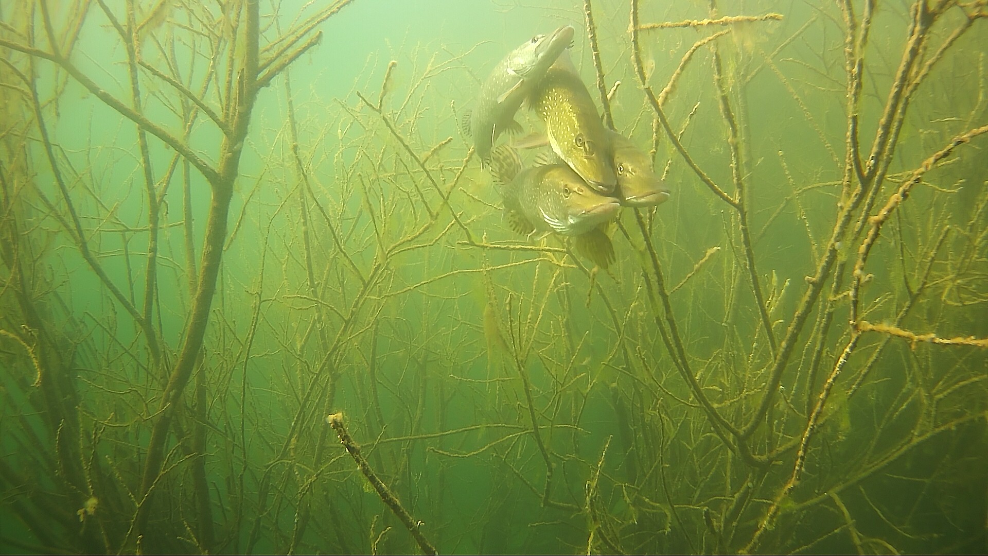 13.04.2020 – Gut dass wir zwei Kameras unter Wasser haben, da können wir uns das Ganze noch aus der Nähe anschauen. Und siehe da, jetzt sind es schon vier Hechte auf einem Haufen.