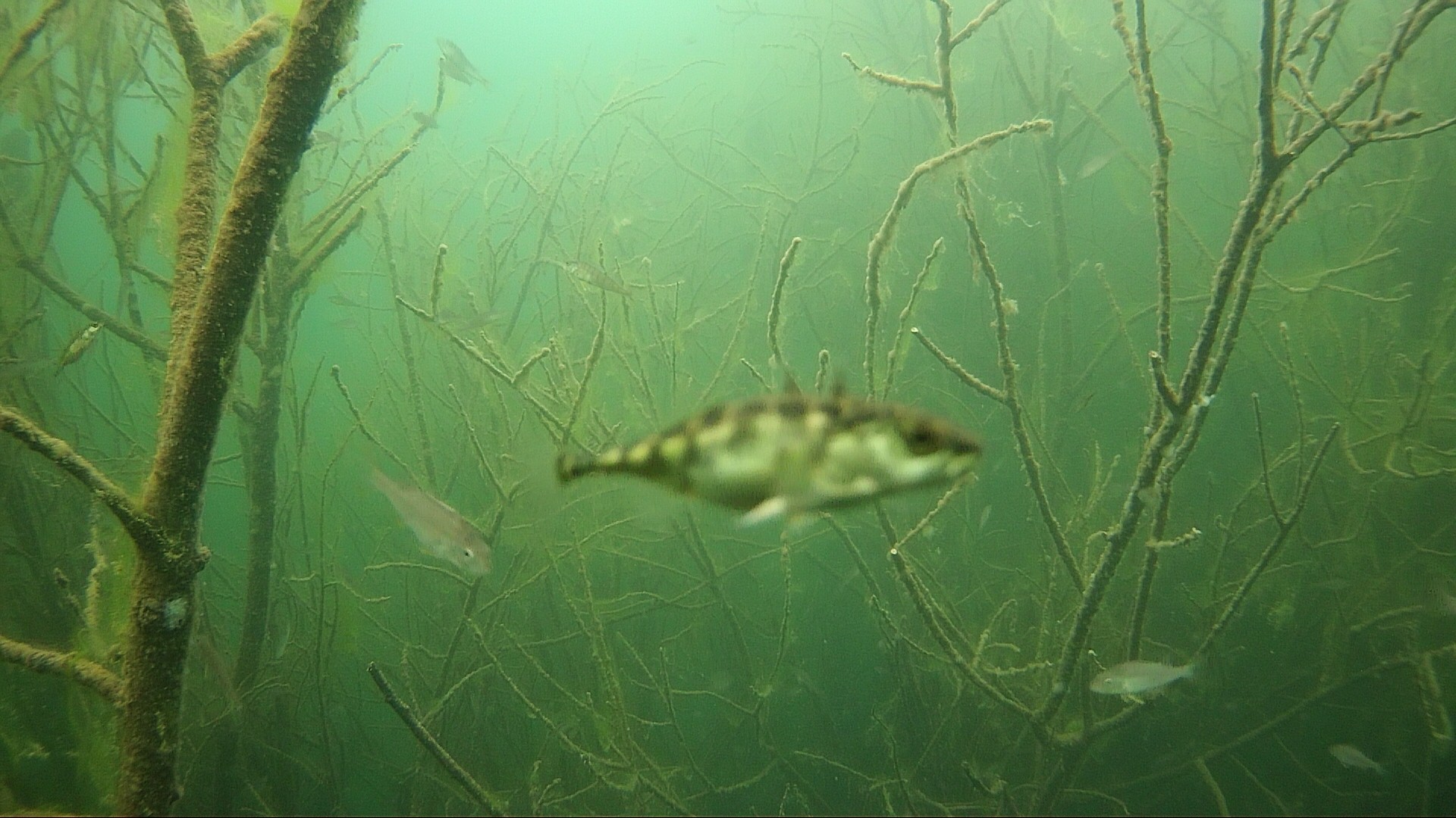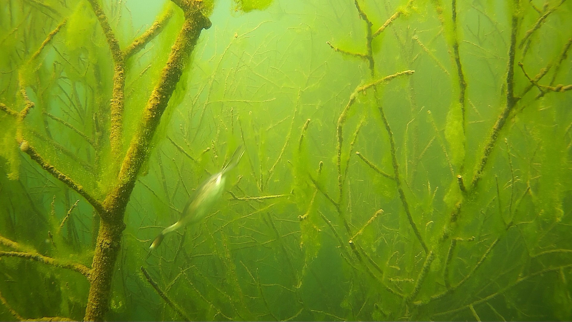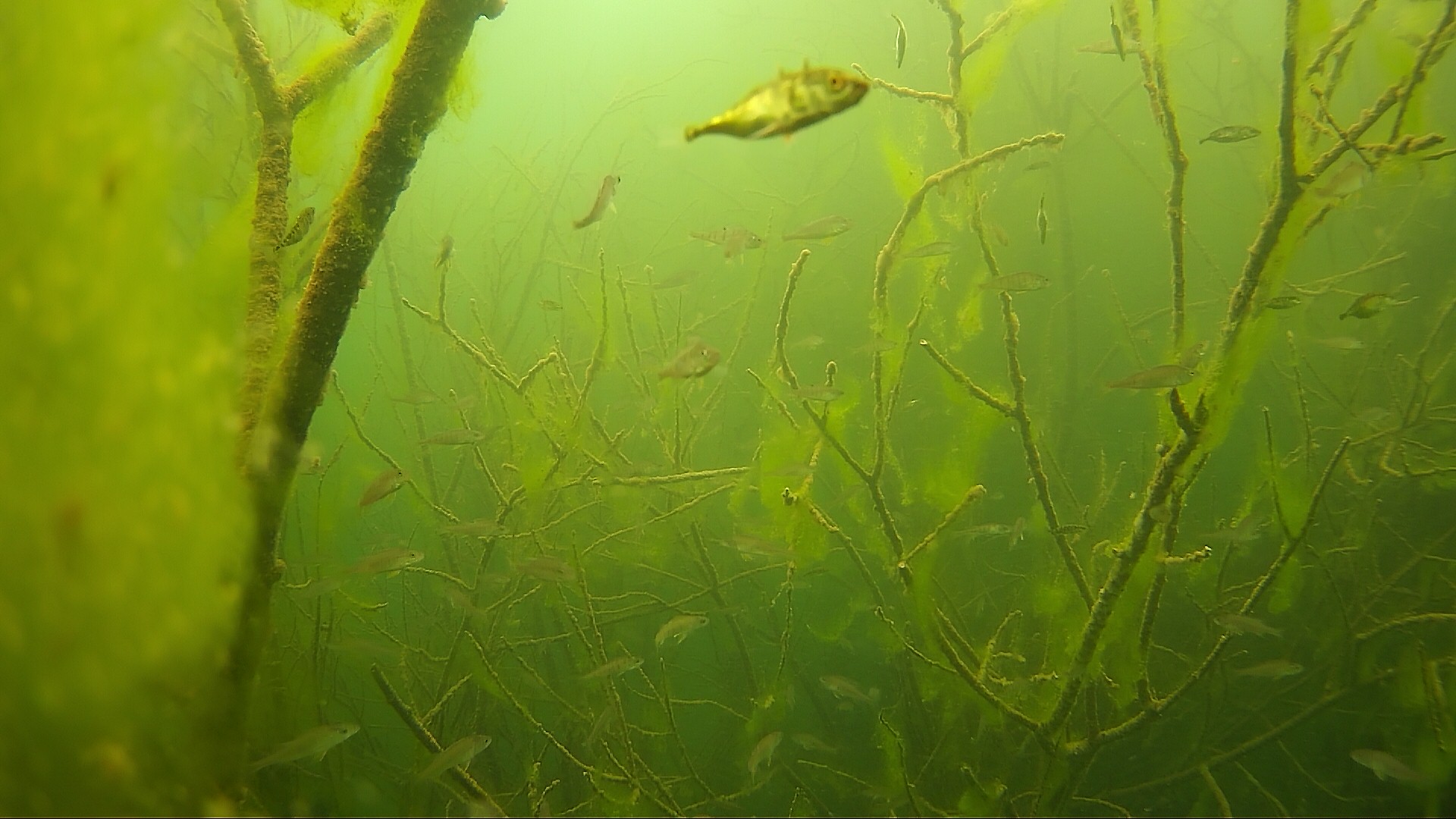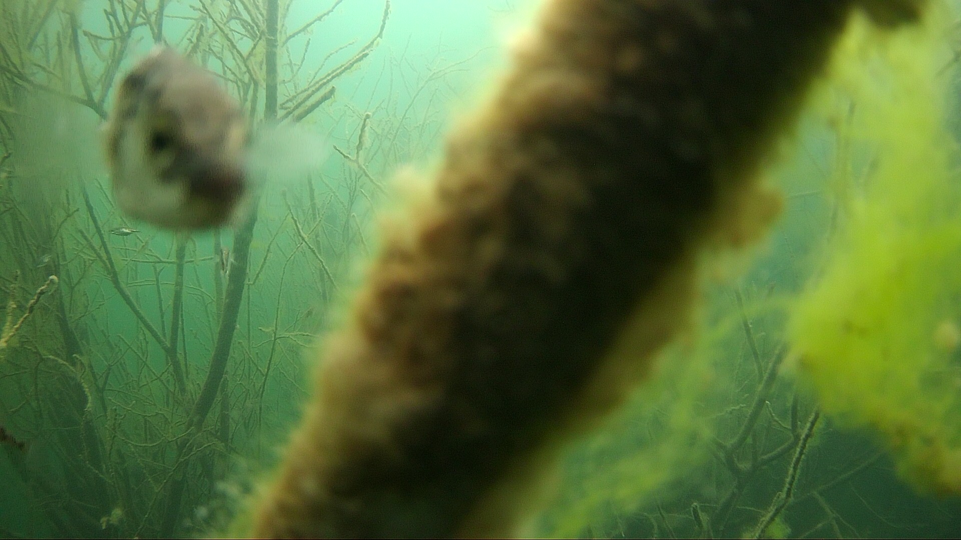 15.04.2020 – Es ist starke Strömung im Bodensee, ein Ast hat sich vor die Kamera gestellt. Da schaut auch der Stichling interessiert vorbei.