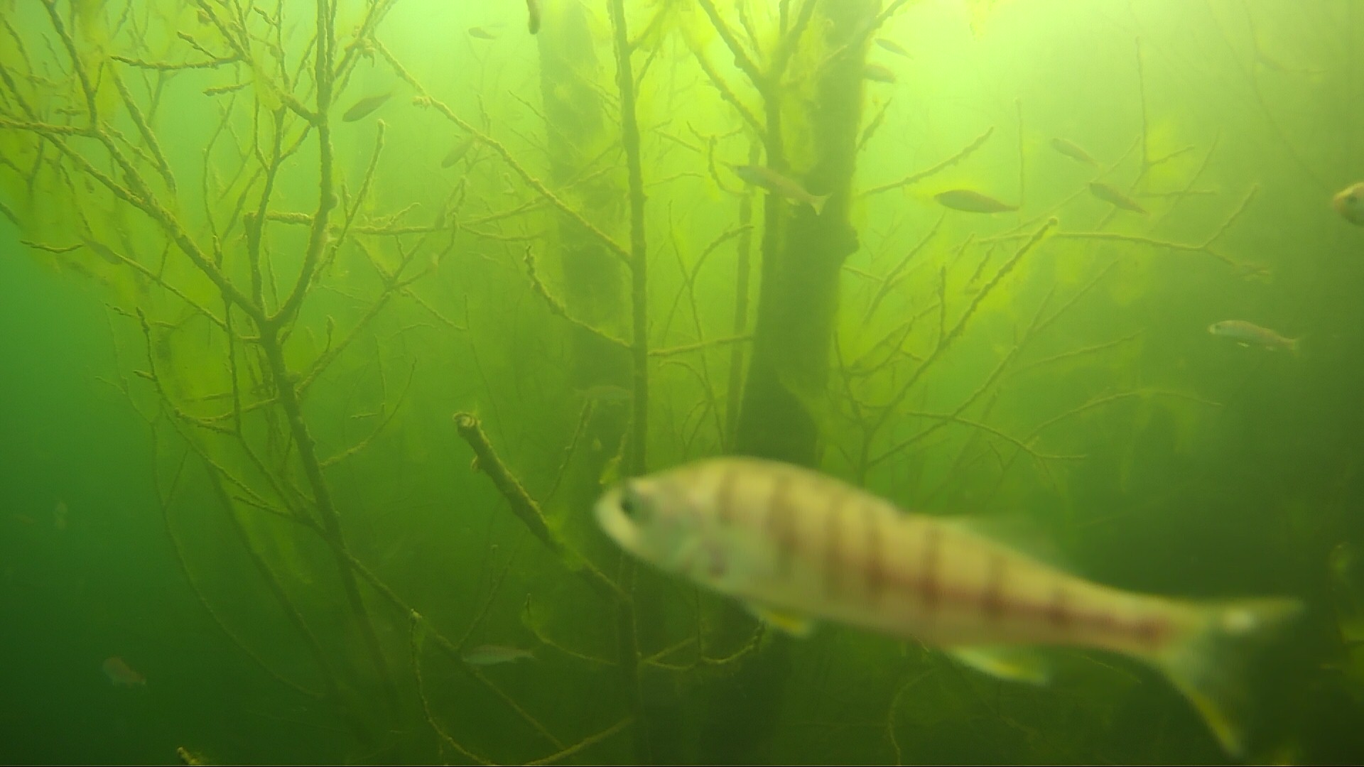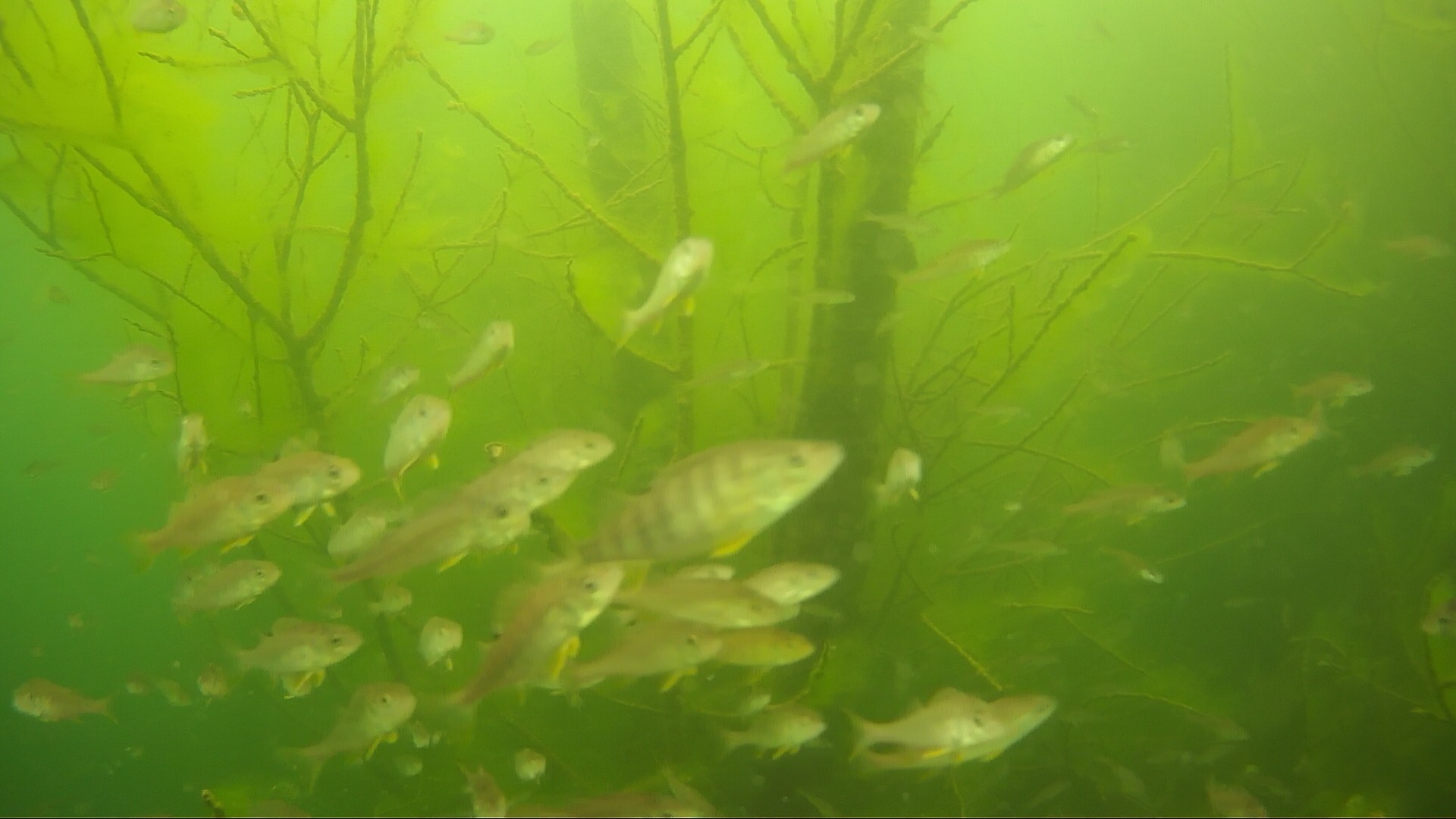 28.04.2020 – So kennt und liebt man die Fische, als gut koordinierter Schwarm. Die Flossen der Barsche erscheinen bei den Lichtbedingungen gelblich. Eigentlich sind sie aber rötlich.