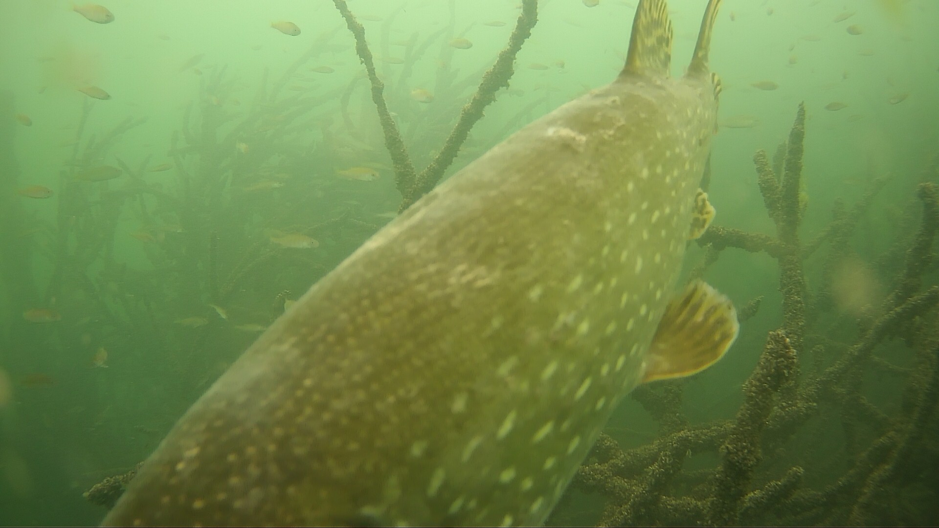 29.09.2020 – Achtung U-BOOT. Die Haut des Hechtes lässt Spuren seines schon längeren Lebens im Wasser erkennen.