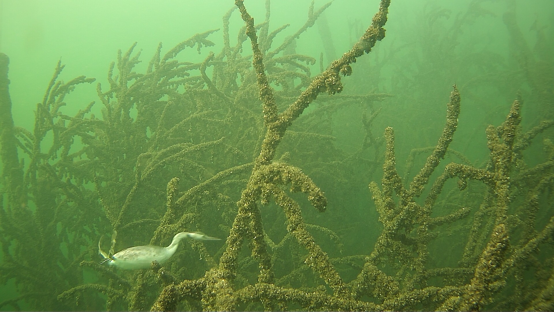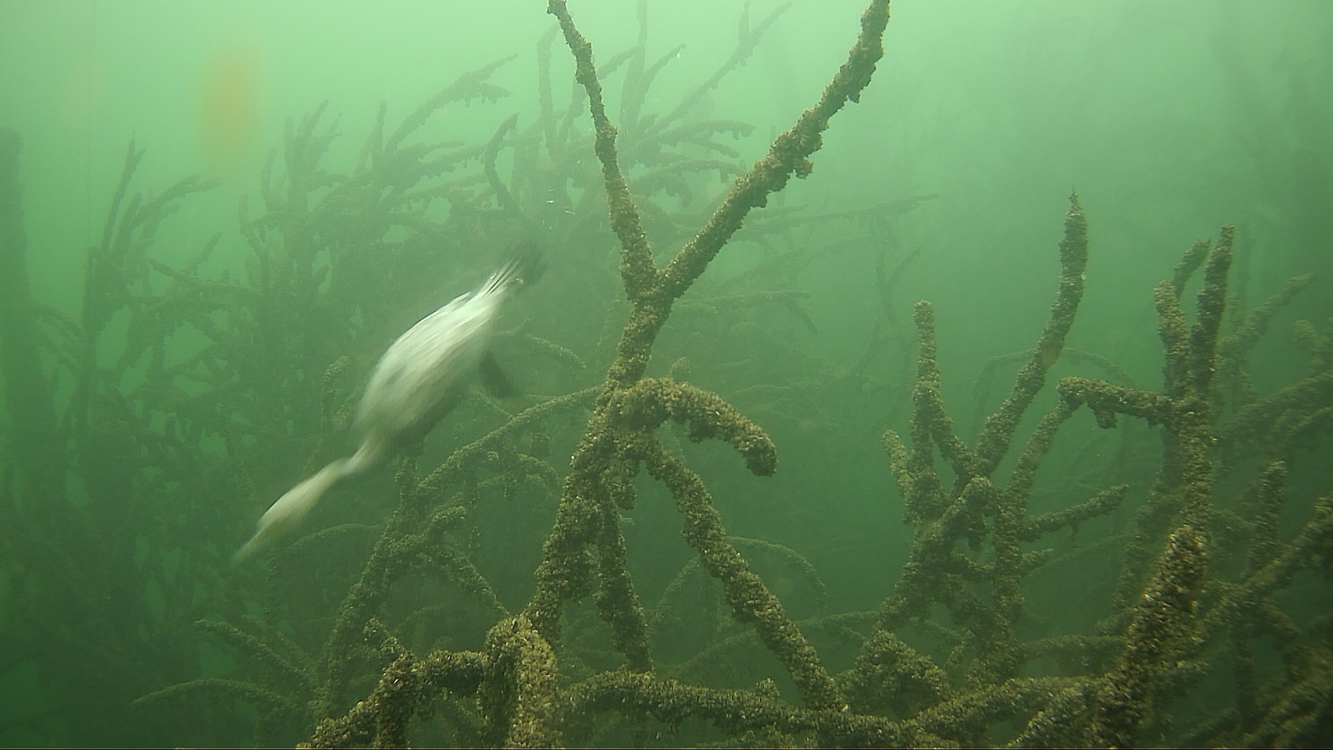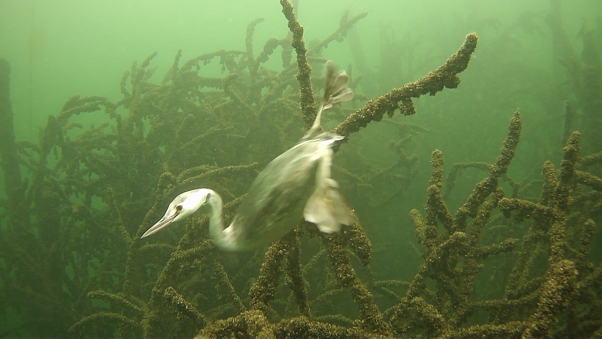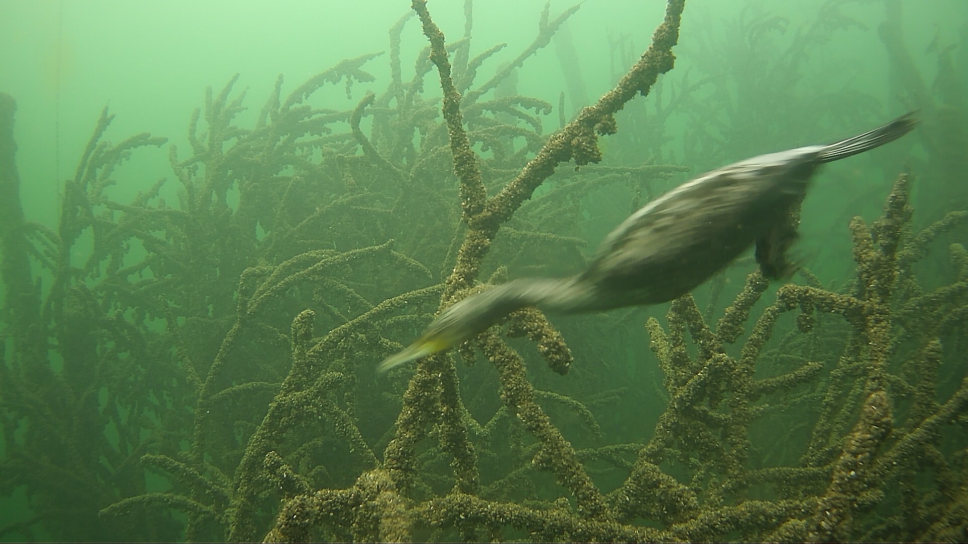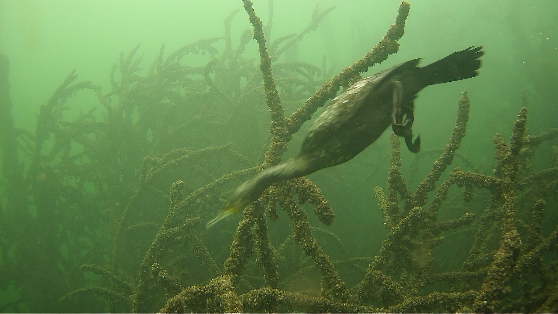14.10.2020 – Gestochen scharf taucht der Kormoran vor der Kamera ab. Der Schwanz scheint etwas aufgefächert zu sein, vielleicht um das Tempo zu drosseln oder die Richtung zu steuern?