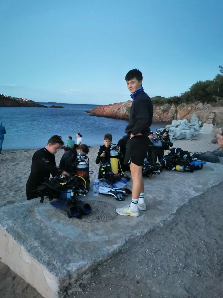 Die Vorfreude war sehr groß, da die Fahrt eigentlich letzten Sommer hätte stattfinden sollen, aber wegen Corona leider verlegt werden musste. Nachdem die zwei Sprinter, welche uns sicher nach Le Dramont, an die Côte d‘Azur und wieder zurück brachten, mit den Taschen, Koffern und dem Tauchzeugs beladen waren, wurde sich noch verabschiedet, um sich dann halb schlafend in die Busse zu setzen. Die Busfahrt wurde von den meisten dazu genutzt, um sich zu unterhalten, sich dabei kennenzulernen, oder einfach zu schlafen, dafür war auch mehr als genug Zeit. Denn dieses Jahr hatten wir mit dem Verkehr eher weniger Glück, und nach etlichen Staus und 12 Stunden Fahrt kamen wir alle fertig und noch müder als beim Einstieg auf dem Campingplatz in Le Dramont an. Als die Mobil Homes bezogen waren und sich jeder mit seinen Mitbewohnern vertraut gemacht hatte, gab es eine spendierte Pizza.