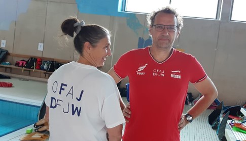 Der Donnerstag begann mit Training in der Schwimmhalle. Auf drei Bahnen wurden die deutschen und französischen Sportler gemischt und von Tobias in Deutsch und Französisch angeleitet. Claudia und Aurélie versuchten sich in Zeichensprache und Cedrik probierte es in Englisch.