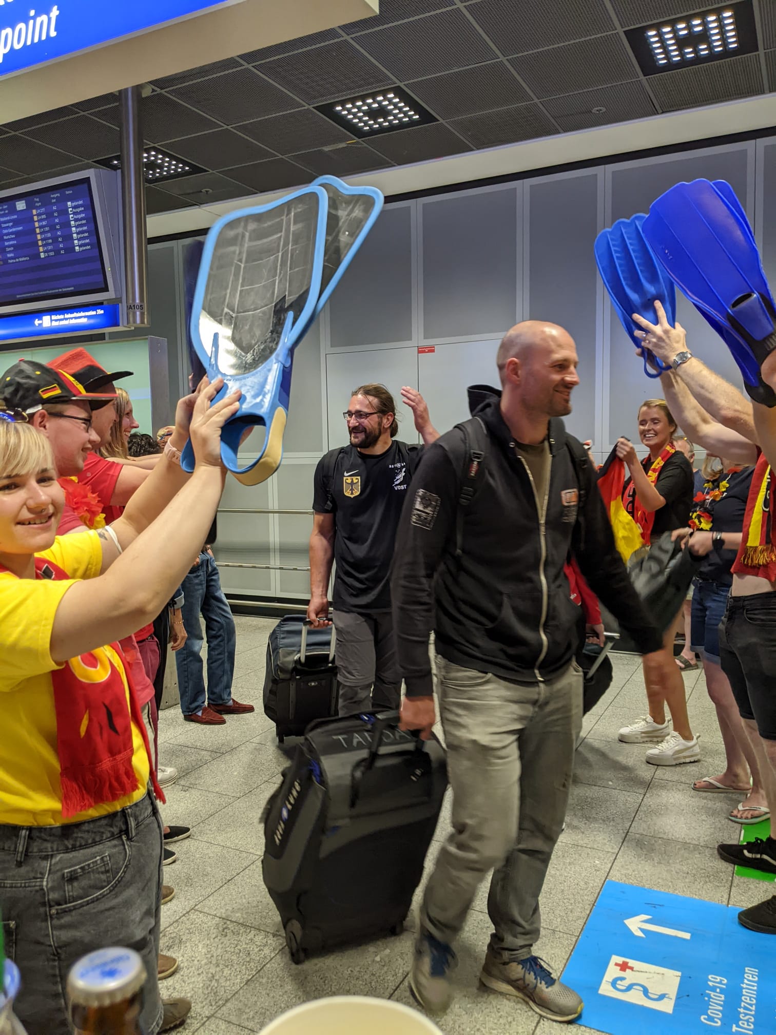 Der Tag nach dem Finale diente der Regeneration und dem Rückflug. Glücklicherweise gab es keinen Flugausfall und auch keine Fehlallokation von Reisegepäck. Dass das Flugzeug Verspätung hatte, ist derzeit wohl ein hinzunehmendes Randproblem. So musste auch die zur Begrüßung der süddeutschen EM-Teilnehmer angereiste Trainingsgruppe der UW-Rugby-Kooperation SSC Karlsruhe-TSV Malsch geduldig auf die Aktiven aus Norwegen warten. Die frischgebackenen Medaillengewinner waren ihrerseits total überrascht, als sie nach dem Einsammeln ihrer Gepäckstücke in die Ausgangshalle des Flughafens kamen. UW-Rugby-Flossenspalier, Partystimmung und Jubelgesänge, kühle Getränke, frisch Gebackenes – eine tolle kleine Partie mit großem Flair zur Feier der Erfolge, ein beeindruckender Abschluss dieser Europameisterschaften und wohl die erste UW-Rugby-Fete am Flughafen Frankfurt.