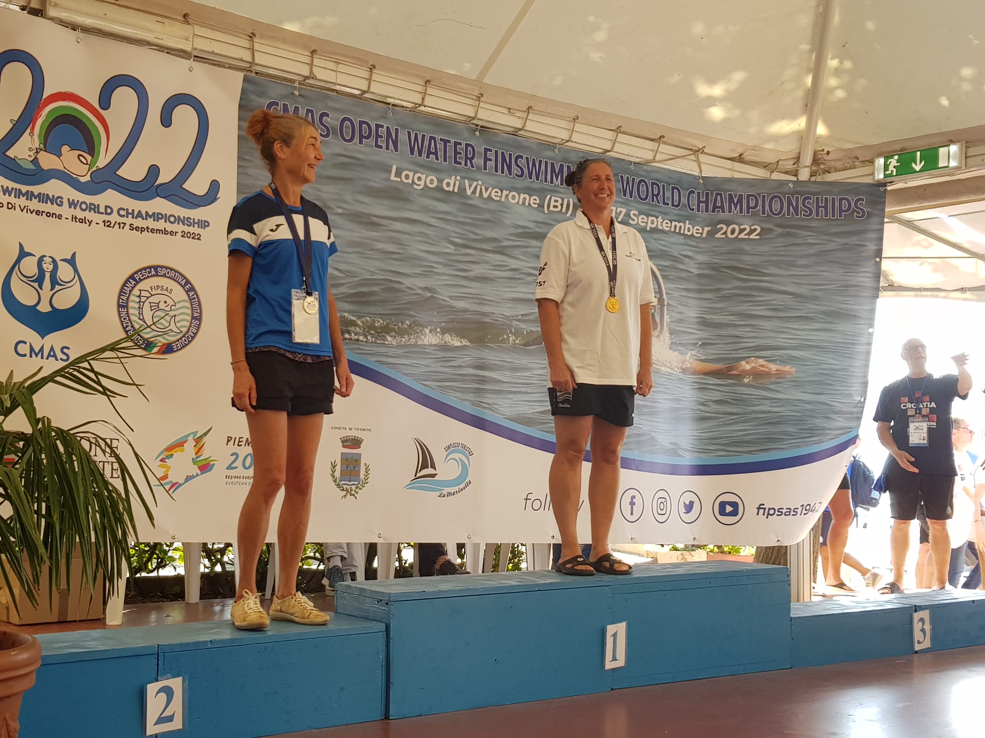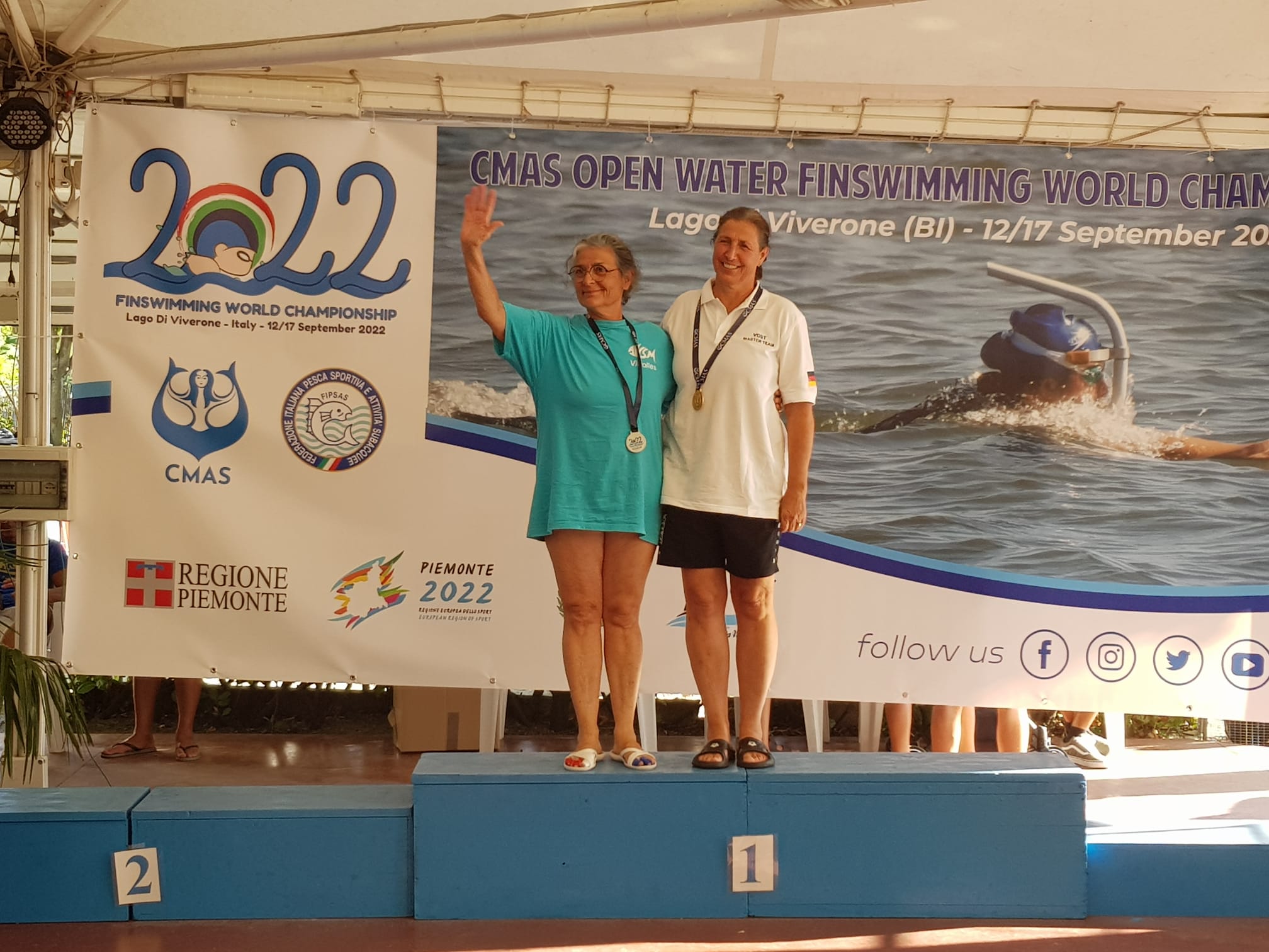 Am Mittwoch stand die Strecke über einen Kilometer mit Bifins, das sind für den Wettkampfsport genormte Flossen, an. Claudia schaffte es in ihrer Altersklasse in 15:22 Minuten
