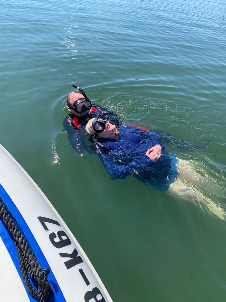 Samstag früh um 7:45 Uhr startete die Praxis traditionell im Vereinsheim des TSC Graben Neudorf. Nach einer Vorstellungsrunde, einer kleinen Stärkung und der Gruppeneinteilung konnte es losgehen. Eine Einweisung in das Boot, dann wurden Fahrgemeinschaften gebildet und ab an den nahegelegenen See zum praktischen Teil. Im Briefing wurden die Übungen durchgesprochen und ein ausführlicher Ausrüstungscheck gemacht und hinein ins kühle Nass. Dort standen nun die verschiedenen Rettungsübungen mit und ohne Gerät an und alle Teilnehmenden kamen hier kräftig ins Schwitzen. Zum Abschluss noch Boje setzen, Nachbriefing und dann voller Vorfreude zurück ins Vereinsheim.
