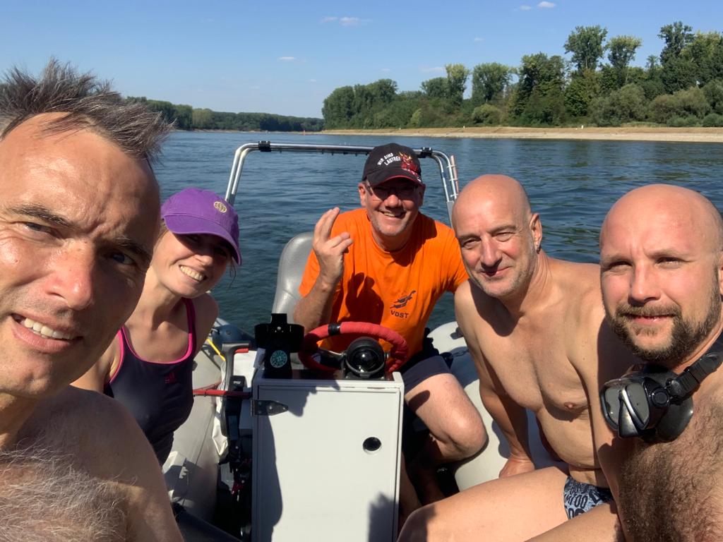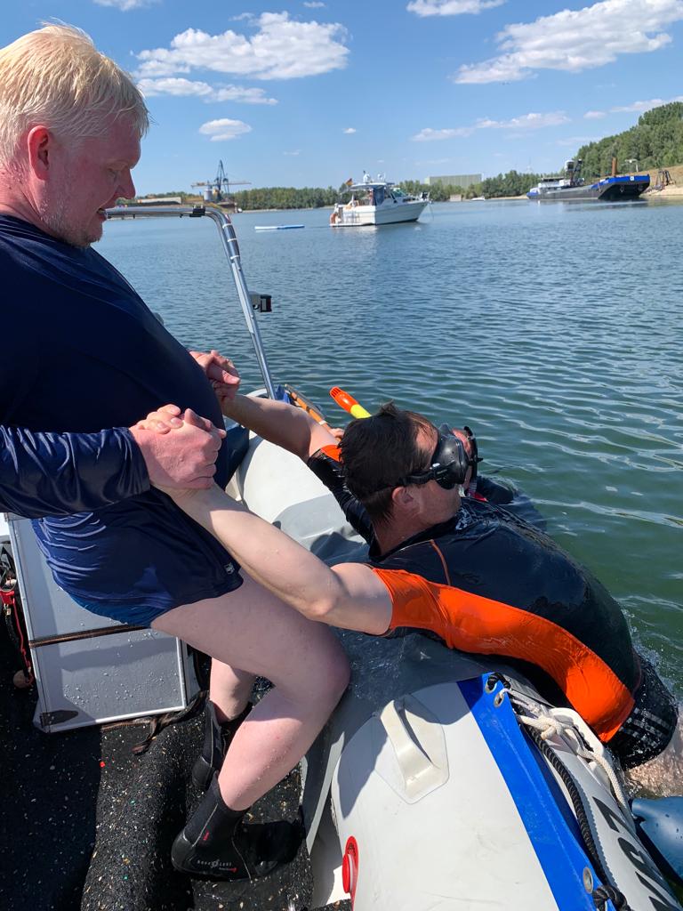 Die dritte Station war die Rettungsübung ins Schlauchboot, traditionell am Rhein. Bei strahlend blauem Himmel und sommerlichen Temperaturen ein echtes Highlight. Zunächst ging es ins Wasser und man übte den eigenen Einstieg ins Schlauchboot. Danach folgte dann das Retten eines Verunfallten zu und ins Boot, immer mit Blick auf Eigen- und Fremdsicherung. Hier gab es vom erfahrenen Bootsführer Armin viele Tipps und Hilfestellungen bis alle Griffe passten.