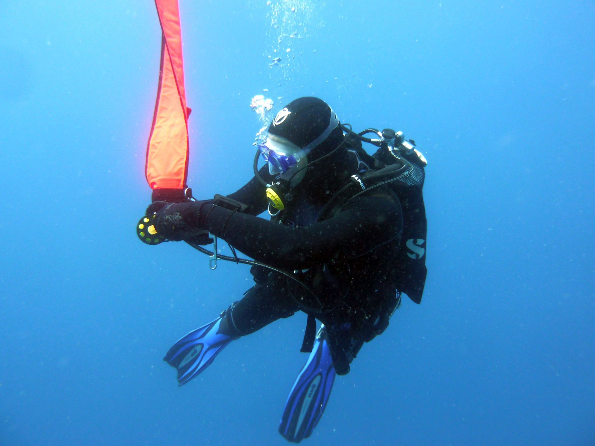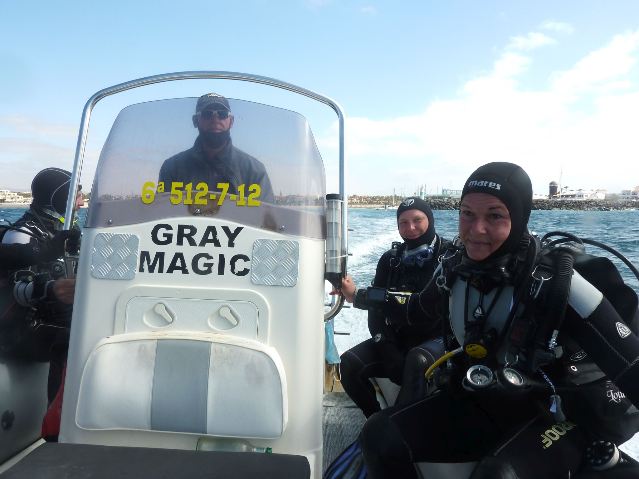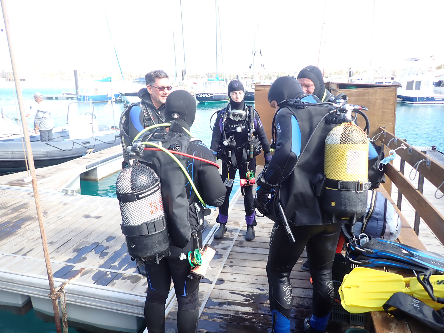 Auch wenn es der Gewöhnungstauchgang ist, hat dieser schon einiges für uns zu bieten, denn wir beginnen mit Übungen zum Wasser-Nase-Reflex, Bleicheck und Jacket an- und ausziehen am Boot bei 2-3 m hohen Wellen, Strömung und Windstärke fünf! Mit großer Mühe bewältigen die Anwärter die Aufgaben an der Wasseroberfläche, bevor es zum ersten Mal heißt: abtauchen.