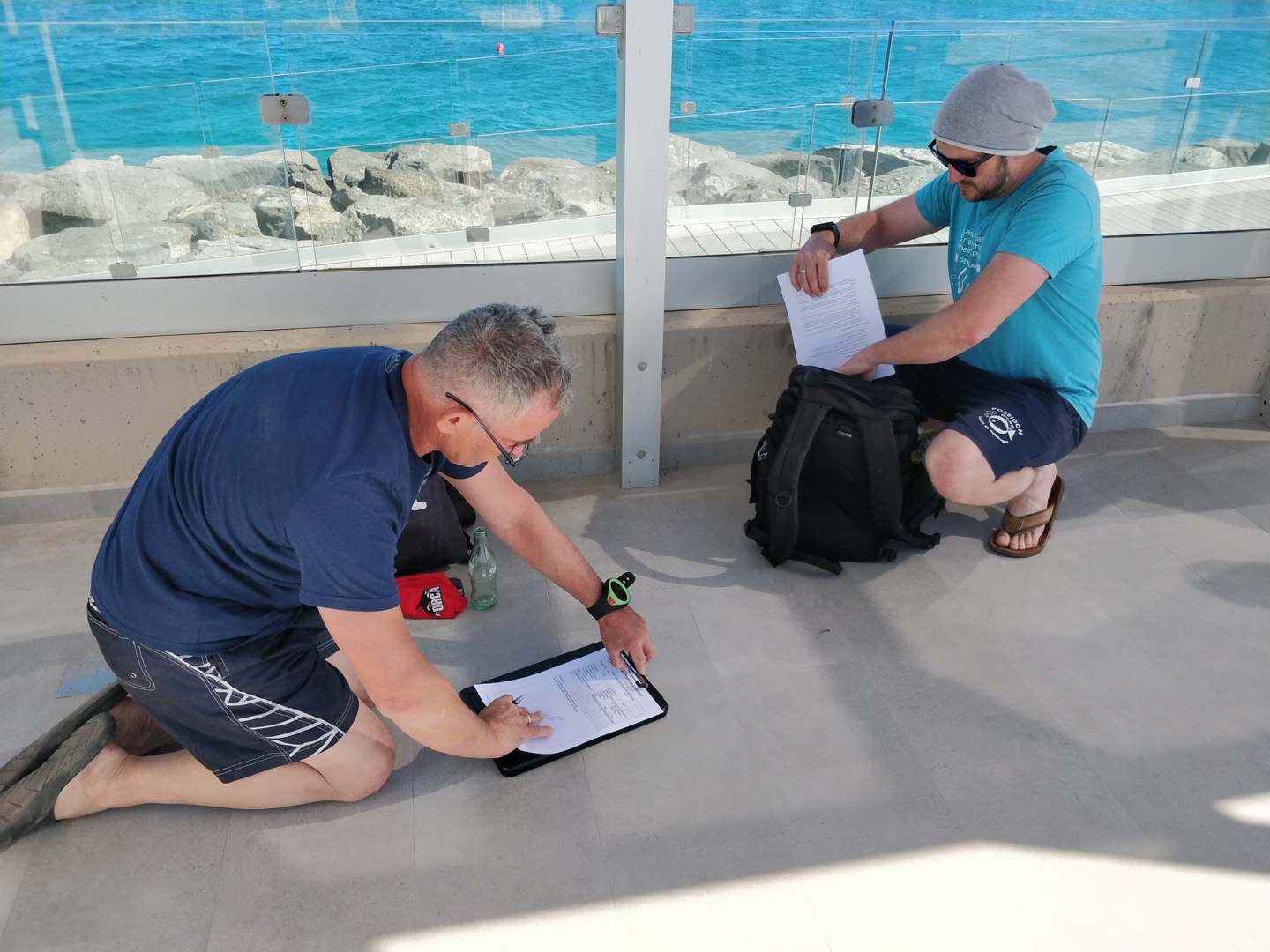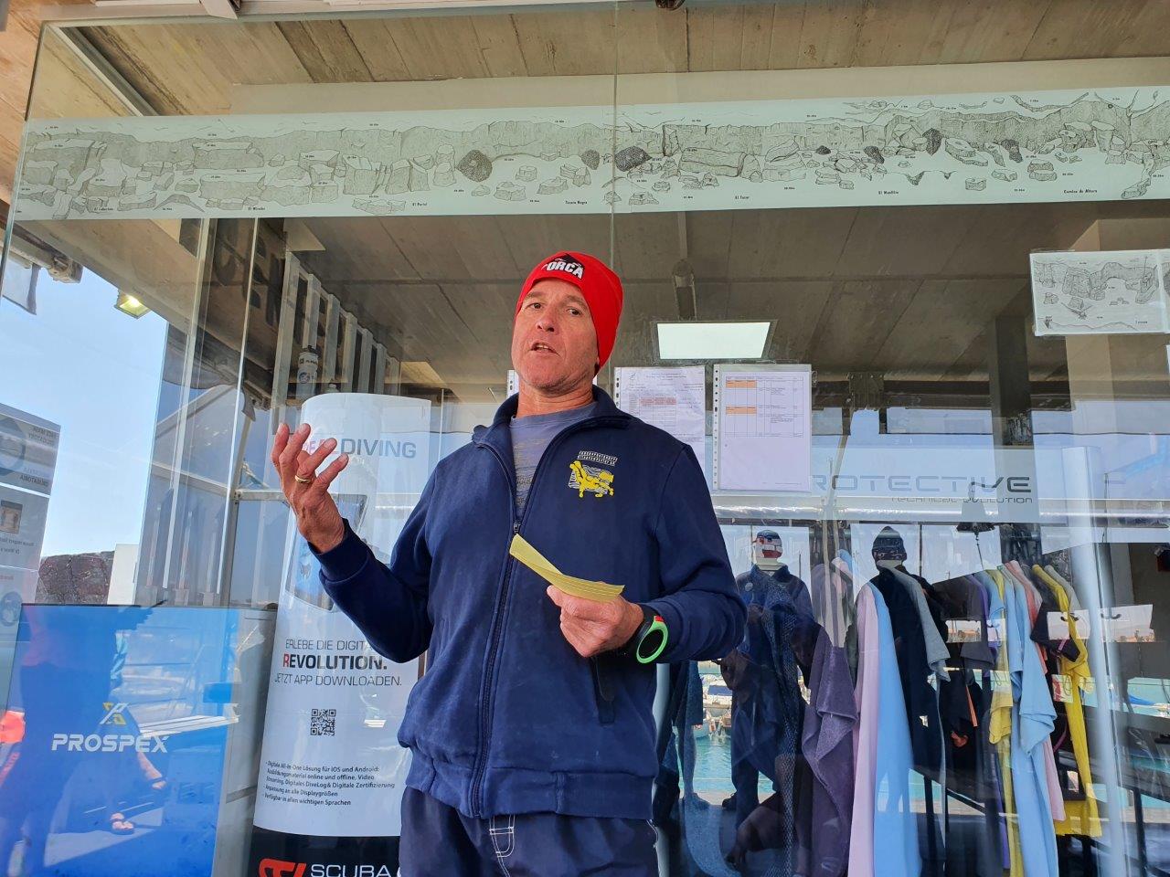 Endlich steht der erste Gerätetauchtag an. In Vorbildfunktion demonstriert Ausbilder Frank den Job des TLvD, bevor morgen die Anwärter diese Aufgabe übernehmen dürfen. Die Tagesstruktur ist geklärt und Tiemo darf mit dem ersten Referat zum geplanten Tauchgang starten.