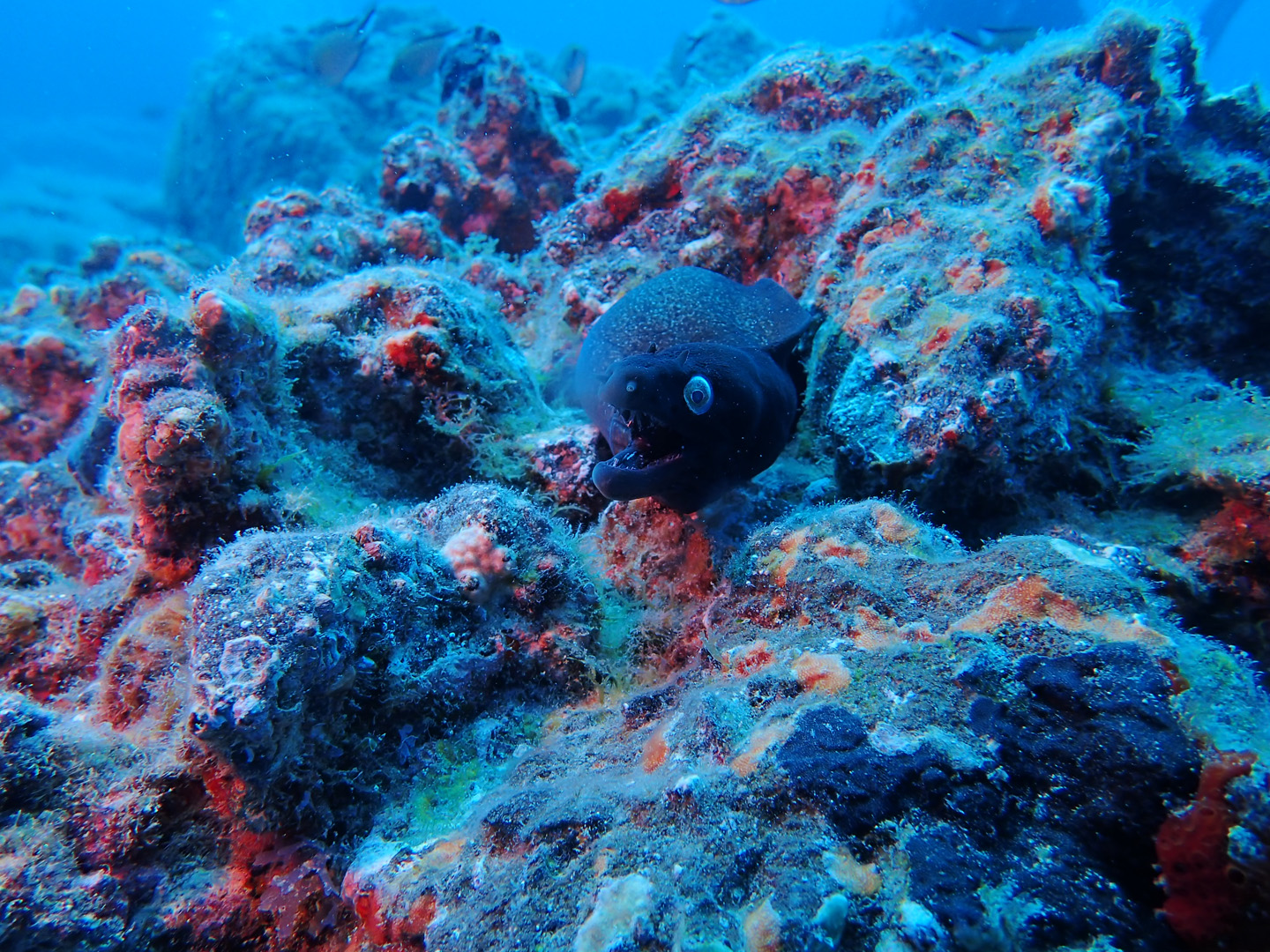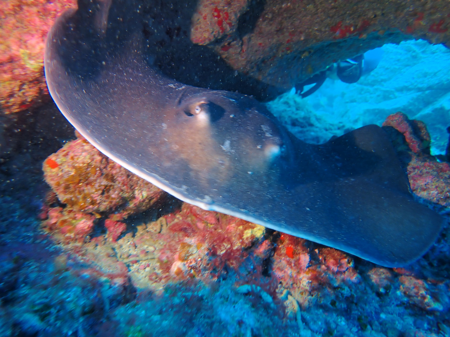 Heute ist sehr viel zu sehen! Die eine Gruppe wird auf 40 Metern von einem prächtigen Atlantischen Stachelrochen und unzähligen Sandaalen begrüßt – in diesem Ambiente mit so vielen Zuschauern lässt sich der Aufstieg wunderbar beginnen.