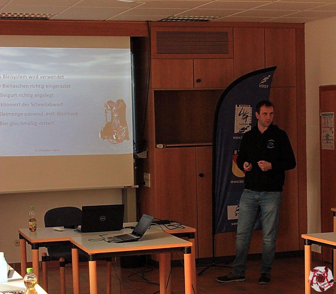 Am nächsten Morgen ging es, nach einem reichlichen Frühstück, frisch gestärkt an die Langfragen. Unsere Anwärter meisterten diese Aufgabe mit Bravour, obwohl sich der ein oder andere nicht ganz sicher schien. Von den korrigierenden Prüfern konnte ein hoher Wissensstand festgestellt werden, der für eine gute Vorbereitung sprach. Die von den Anwärtern erstellten Vorträge, wurden über verschiedenste Aspekte des Tauchens gehalten. Hier kamen Themen wie Erste Hilfe beim Tauchen, Ausrüstung des Tauchers, Dekompressionskrankheiten und viele andere zur Sprache. Auch hier waren die Leidenschaft und der Wissensstand der Vortragenden zu bemerken. Während einer gefühlt kurzen Pause, in der wir zu Mittag aßen, konnte wieder Kraft für die restliche Prüfung gesammelt werden. Am Nachmittag folgten Medizin und Herz Lungen Wiederbelebung, die parallel zueinander abgenommen wurden.