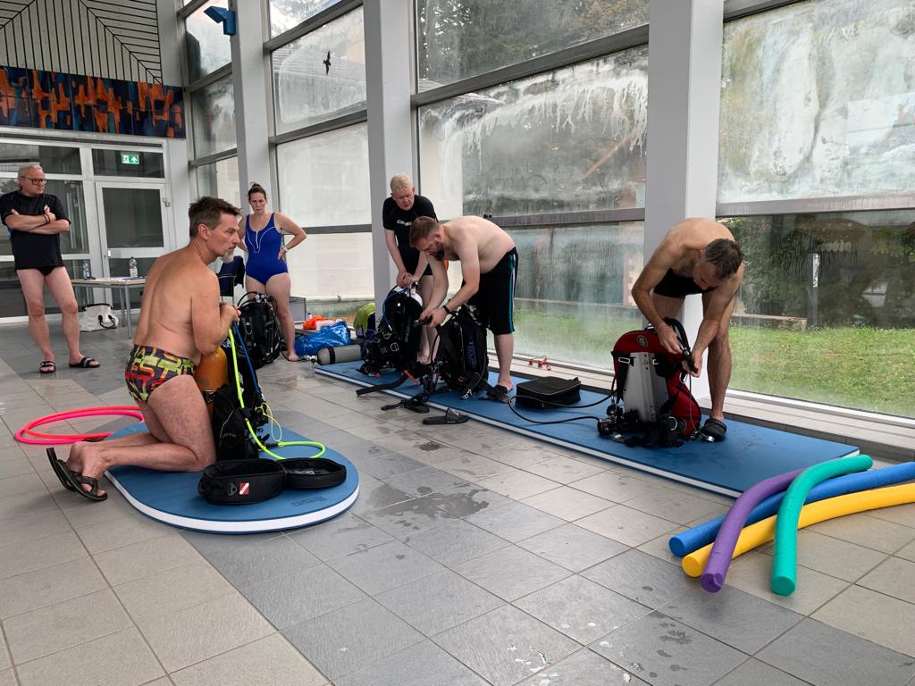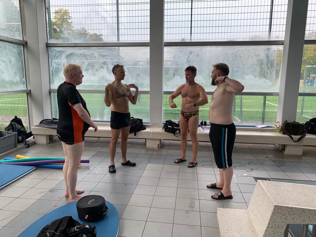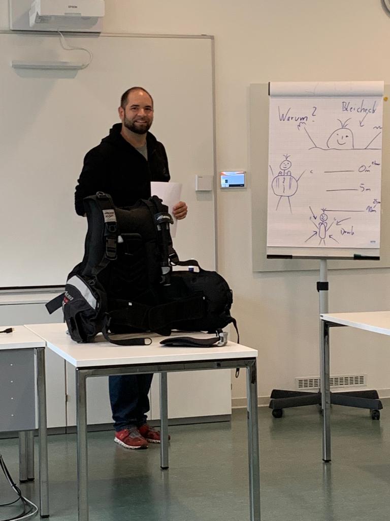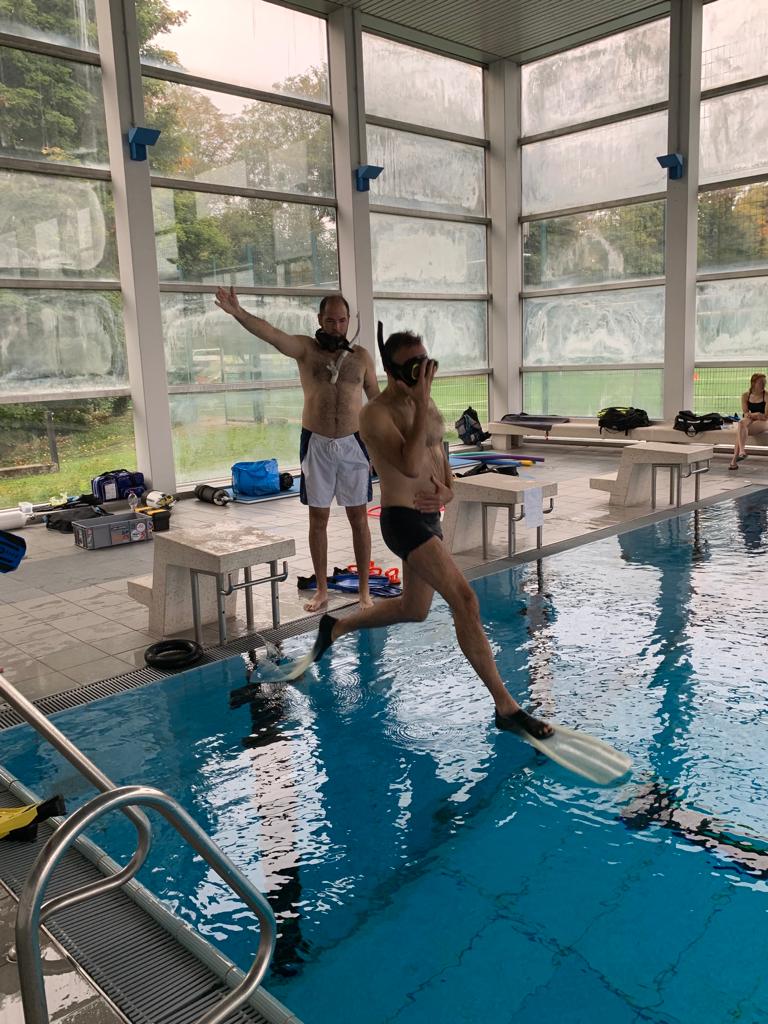 Den Abend nutzen die meisten noch, um sich etwas auf die zweite schriftliche Prüfung, vorzubereiten. Denn am Mittwochmorgen stand die Überprüfung vom Badischen Sportbund an. Der Überfachliche Teil waren 15 Fragen die schriftlich beantwortet werden musste. Auch diese Prüfung wurde von allen erfolgreich absolviert, so dass wir alle uns in die schriftliche Ausarbeitung der Lehrproben begaben. 60 Minuten Trainingszeit mussten zu unserem zugelosten Thema gefüllt werden. Aufwärmen, Haupt- und Schlussteil wurden detailliert aufgeschrieben und bearbeitet, so dass die ersten am Mittwochnachmittag schon ihre Lehrprobe bestreiten durften. Unter den strengen Augen von Jo und Volker wurde die ersten beiden Lehrproben mit den Themen Wasser – Nase – Reflex und Maske Ausblasen gehalten. Volker gab für die Lehrprobe Ausschnitte aus der ausgearbeiteten Trainingseinheit vor, die man auf seinem Plan notiert hatte. Nicht nur das Ansagen und Vormachen der Übungen wurde bewertet, sondern auch die methodische und schlüssige Gestaltung des Übungsplans. Fortgesetzt wurden die Lehrproben am Donnerstagvormittag. Die beiden verbliebenen Themen Sprünge mit ABC und Zeittauchen wurden schnell abgehandelt, danach ging es in die vier Prüfungen zum Thema DTG (Aufbau, Tarieren, Rettungsübung, …). Nach jeder Prüfung bekamen wir sofort immer ein kleines Feedback, so dass wir alle schon ungefähr wussten in welche Richtung das Prüfungsergebnis zeigt.