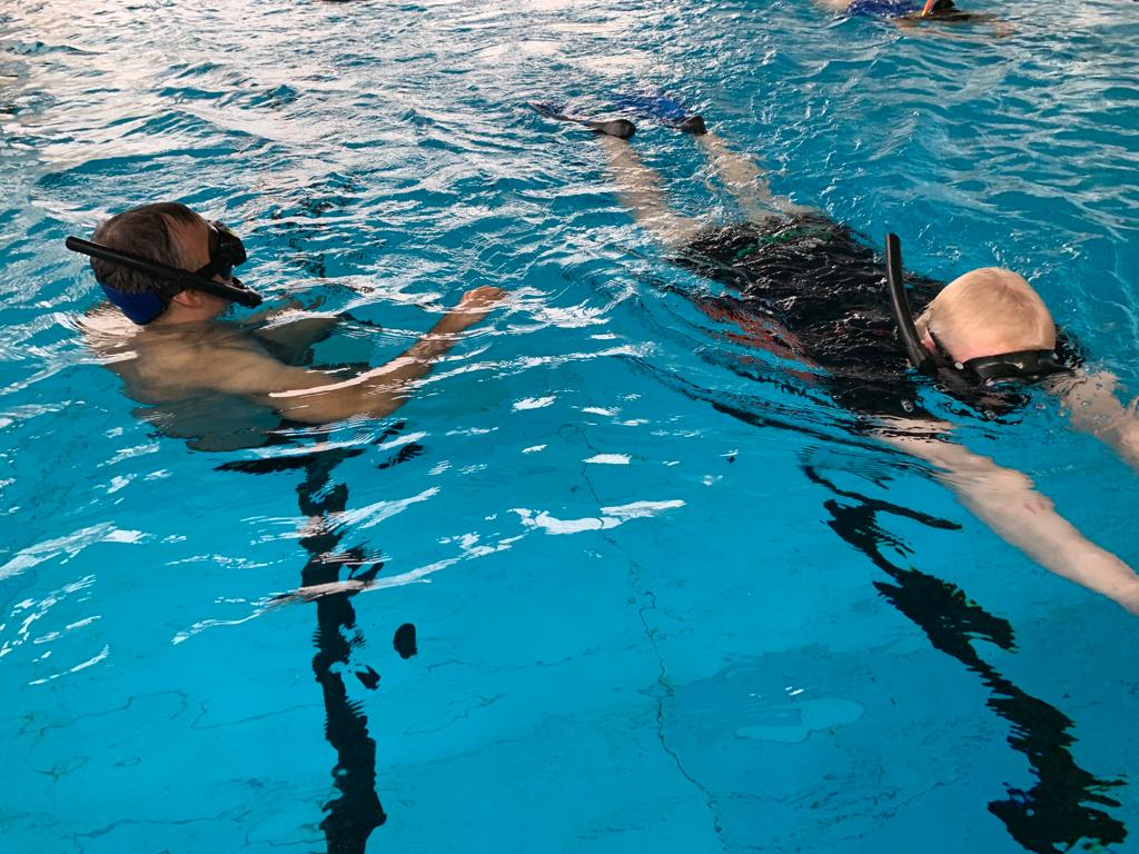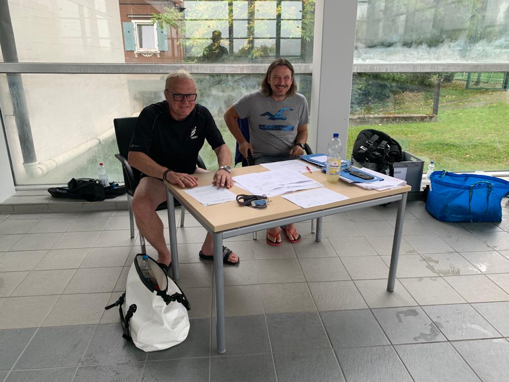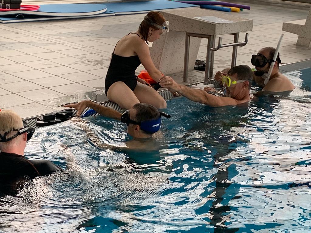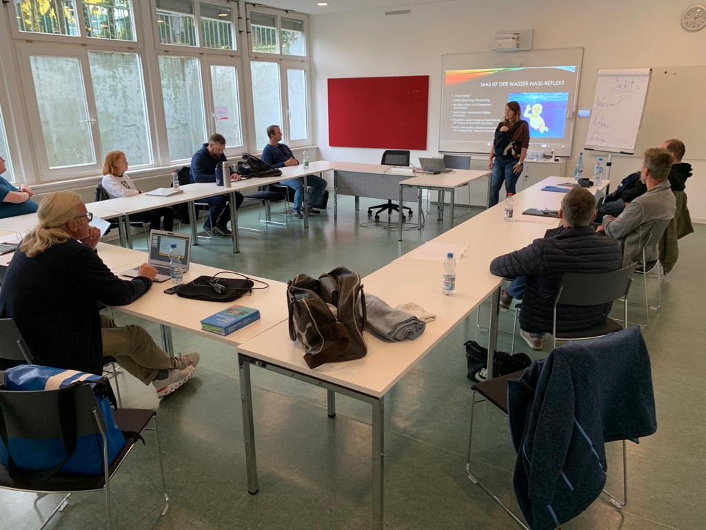 Den Abend nutzen die meisten noch, um sich etwas auf die zweite schriftliche Prüfung, vorzubereiten. Denn am Mittwochmorgen stand die Überprüfung vom Badischen Sportbund an. Der Überfachliche Teil waren 15 Fragen die schriftlich beantwortet werden musste. Auch diese Prüfung wurde von allen erfolgreich absolviert, so dass wir alle uns in die schriftliche Ausarbeitung der Lehrproben begaben. 60 Minuten Trainingszeit mussten zu unserem zugelosten Thema gefüllt werden. Aufwärmen, Haupt- und Schlussteil wurden detailliert aufgeschrieben und bearbeitet, so dass die ersten am Mittwochnachmittag schon ihre Lehrprobe bestreiten durften. Unter den strengen Augen von Jo und Volker wurde die ersten beiden Lehrproben mit den Themen Wasser – Nase – Reflex und Maske Ausblasen gehalten. Volker gab für die Lehrprobe Ausschnitte aus der ausgearbeiteten Trainingseinheit vor, die man auf seinem Plan notiert hatte. Nicht nur das Ansagen und Vormachen der Übungen wurde bewertet, sondern auch die methodische und schlüssige Gestaltung des Übungsplans. Fortgesetzt wurden die Lehrproben am Donnerstagvormittag. Die beiden verbliebenen Themen Sprünge mit ABC und Zeittauchen wurden schnell abgehandelt, danach ging es in die vier Prüfungen zum Thema DTG (Aufbau, Tarieren, Rettungsübung, …). Nach jeder Prüfung bekamen wir sofort immer ein kleines Feedback, so dass wir alle schon ungefähr wussten in welche Richtung das Prüfungsergebnis zeigt.