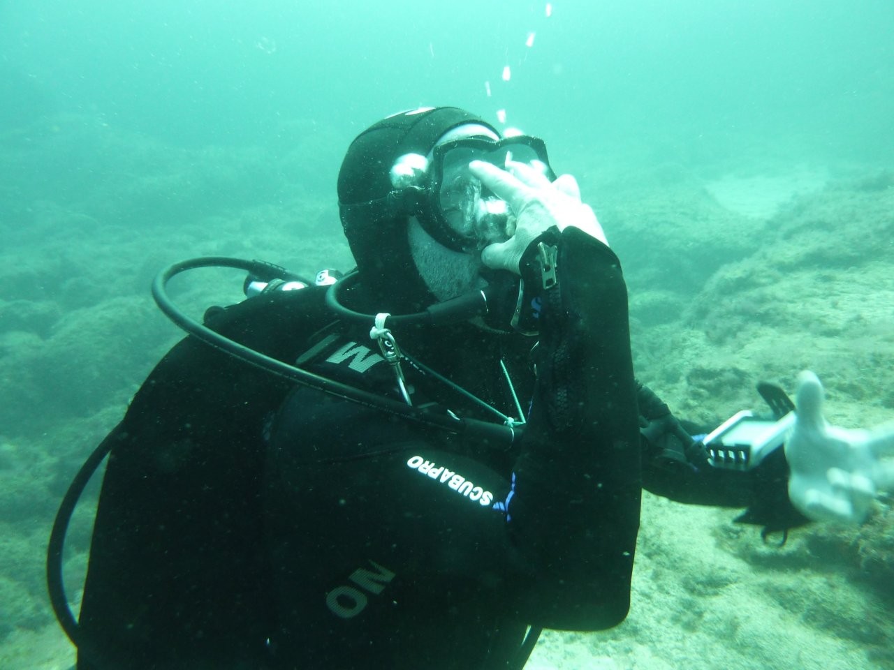 Prüfungstauchgang 2 – fünf Minuten ohne Maske: Nach dem üblichen Mittagssandwich ging es ohne große Pause weiter. Für den zweiten Prüfungstauchgang war Tauchen ohne Maske angesetzt – eine Übung, die im Hallenbad schon unangenehm sein kann, im offenen Meer jedoch ganz eigene Herausforderungen mitbringt.