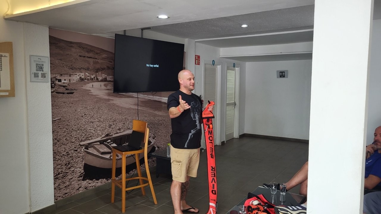 Statt um 8:30 Uhr an der Tauchbasis zu starten, trafen wir uns um 9 Uhr im Fernsehzimmer des Hotels und lauschten spannenden Vorträgen von unserer Taucherärztin Christine, unserem TL3-Hospitanten Huddel (nein, immer noch kein Schreibfehler 😉) und Christian.