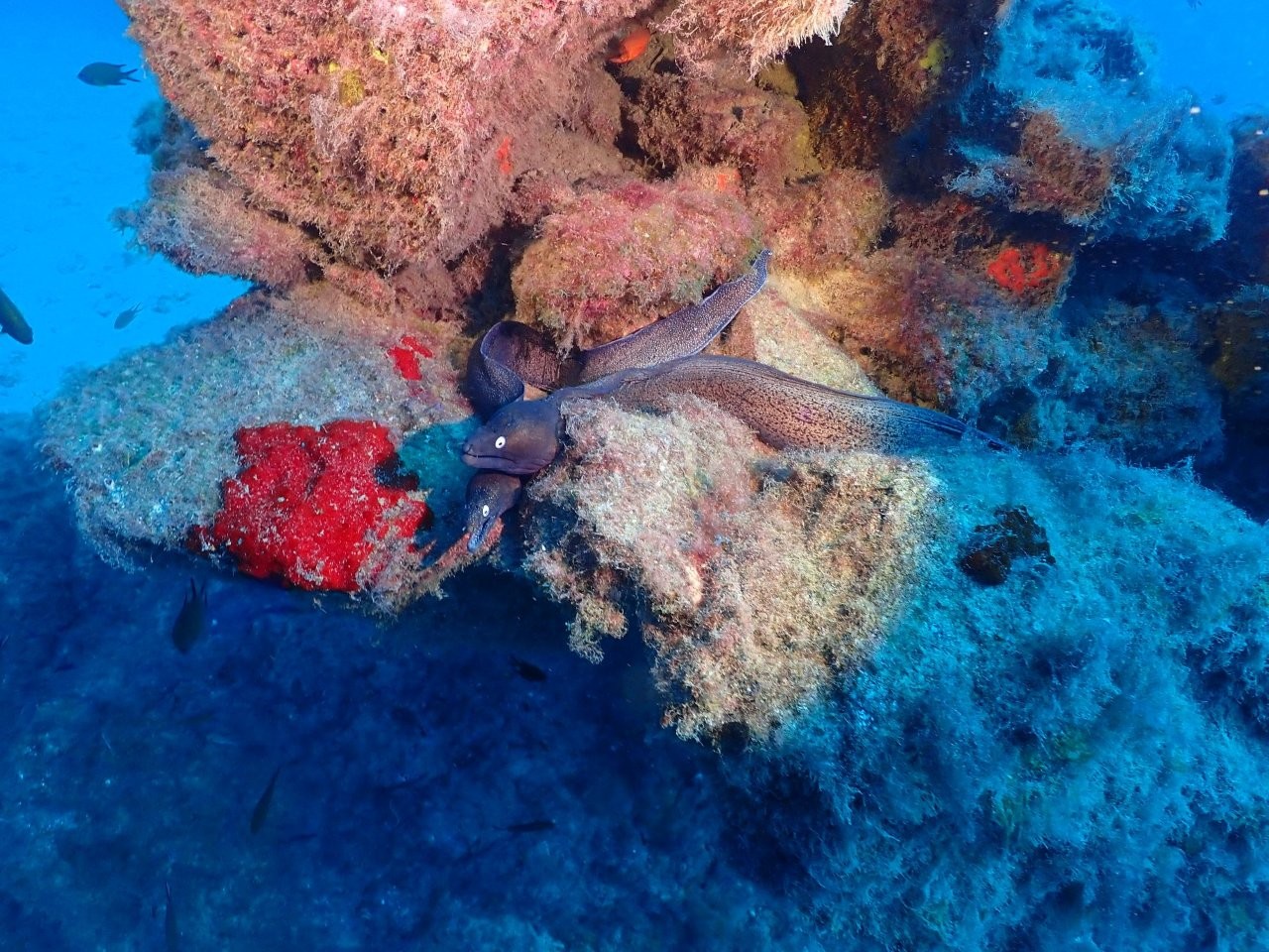Der zweite Tauchgang sorgte dann für etwas Entspannung. Bei der Übung „Orientierung ohne technische Hilfsmittel“ konnte das großartige Riff mit all seinen Bewohnern ausgiebig beobachtet werden. Muränen, Engelshaie, zahlreiche bunte Kleinfische und Drachenköpfe wurden gesichtet – und in der Ferne sogar ein großer vorbeischwimmender Hai!