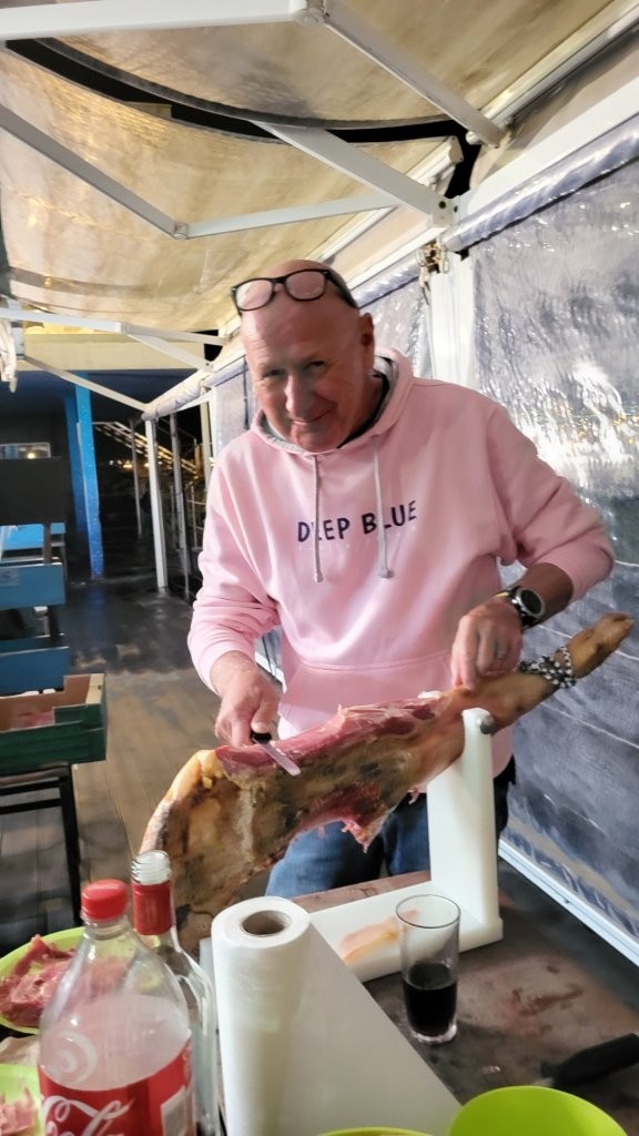 Um 18:30 Uhr wartete in der Basis ein großes gemeinsames Essen mit typisch spanischen Leckereien – Serrano, Aioli, Tapas, Ziegenkäse von der Insel. An dieser Stelle ein besonders großes Dankeschön an Jutta und Volker, die mit beeindruckendem Einsatz über Stunden dünne Scheiben vom Schinken geschnitten haben. In diesem feierlichen Rahmen erhielten wir endlich unsere Tauchlehrer-Urkunden. Die Mühe hat sich gelohnt.