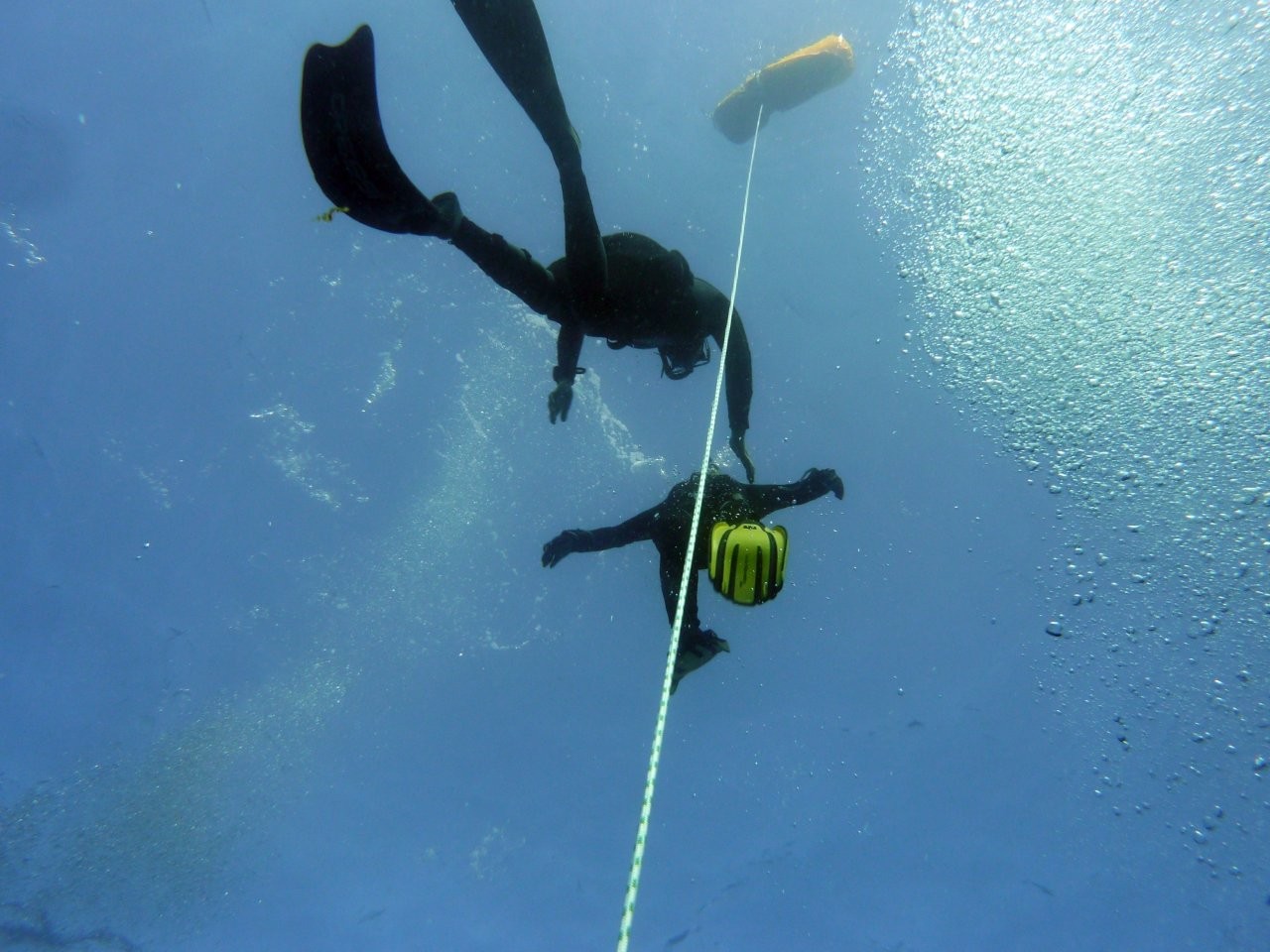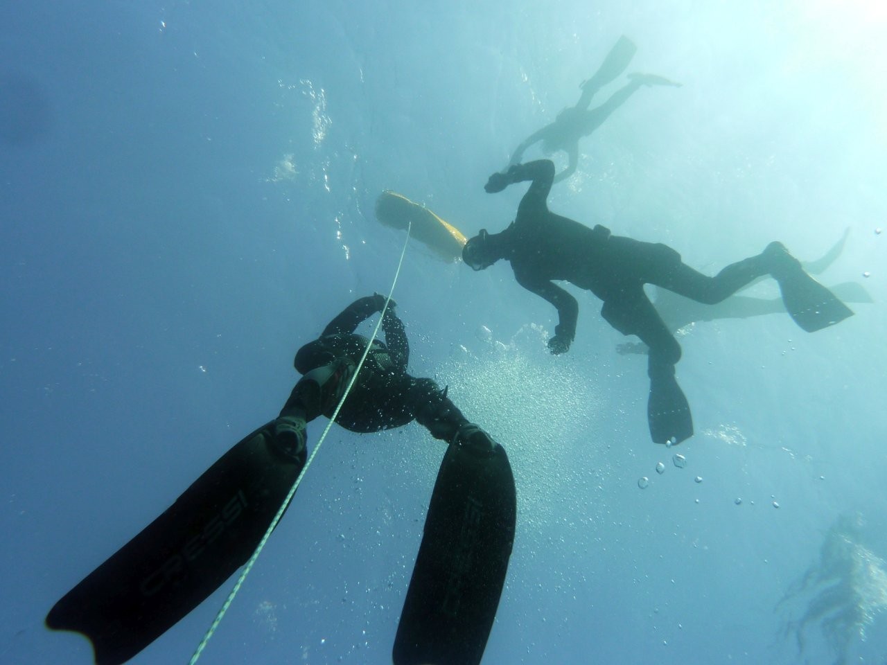 1000 Meter Flossenschwimmen. Was sich für trainierte Taucher und Taucherinnen, die ab und an das Schwimmbadtraining besuchen, nicht als riesige Herausforderung anhört, stellte sich im Meer mit Wellengang und kompletter Neoprenmontur doch als „deutlich sportlich“ heraus. Nach kurzer Erholung folgte das Streckentauchen inklusive des Knotens eines Palsteks unter Wasser. OK, dafür war also das Kletterseil gedacht.🙂